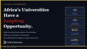 “Africa leapfrogged fixed-line to mobile. It leapfrogged branch banking to mobile money. EON is Africa’s leapfrog moment in higher education. A British-accredited, #6 world-ranked European degree on a smartphone, in Swahili and Hausa and Amharic, at 1% of the cost of studying abroad. Africa’s graduates are world-class. Now their credentials will be too,” Dan Lejerskar, Chairman & CEO, EON AI Ventures