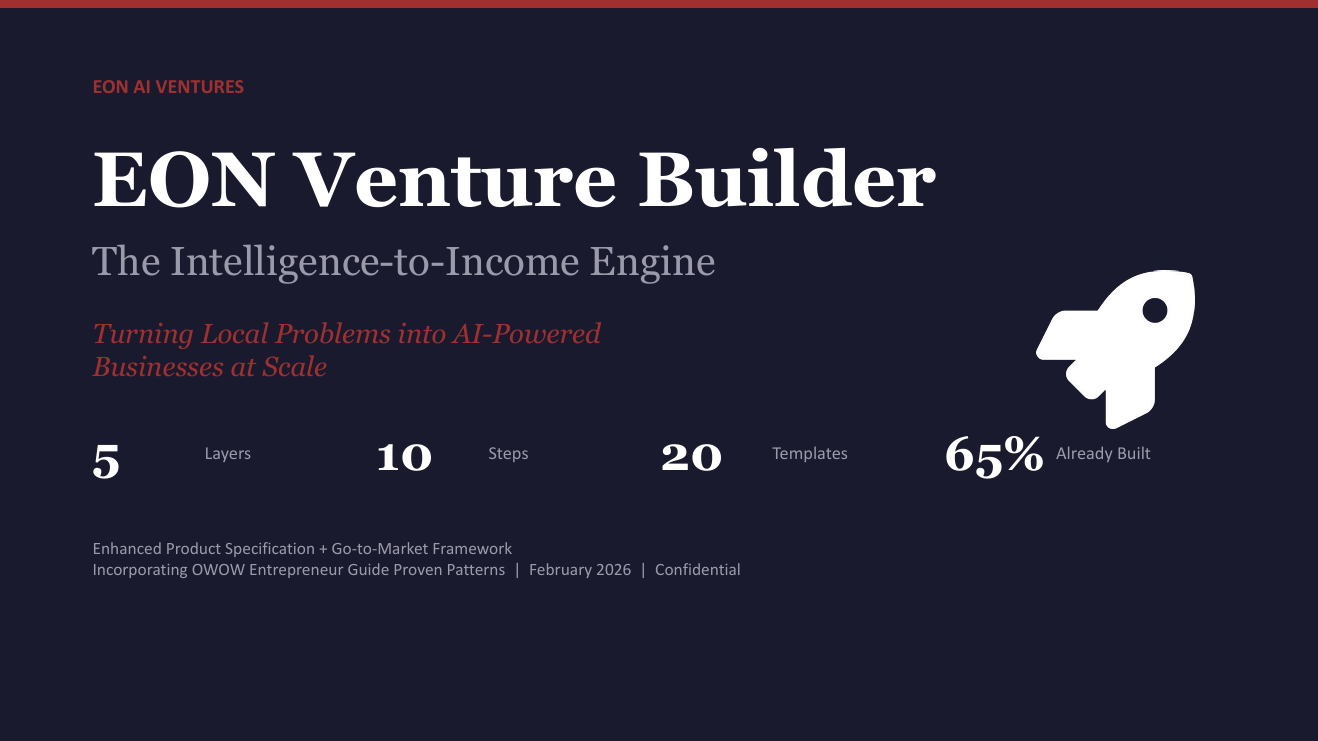 These intersecting forces create a once-in-a-generation opportunity to reimagine entrepreneurship. The EON Venture Builder equips individuals to identify monetizable, community-specific problems, validate solution feasibility, and deploy AI-based businesses with minimal resources, reshaping economies and fostering local innovation.