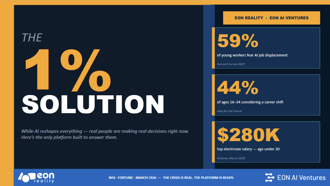 The 1% Solution by EON Reality demonstrates that workforce transformation isn’t a vision for tomorrow—it’s a proven model for today. With debt-free access to high-value skills and scalable infrastructure to navigate the age of AI, EON is building the bridge between global disruption and workforce resilience.